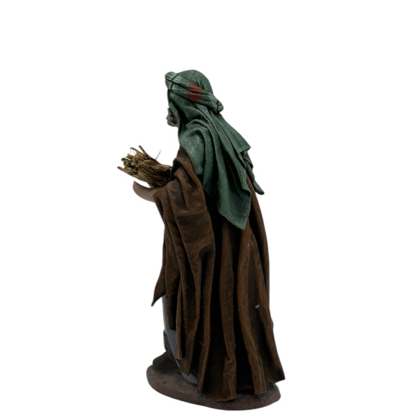 Esta figura de belén está elaborada de manera totalmente artesanal, siguiendo técnicas tradicionales que convierten cada pieza en una pequeña obra de arte. Realizada en barro cocido, ha sido cuidadosamente entelada mediante el proceso de tela encolada, una técnica que aporta volumen, rigidez y un acabado especialmente realista a las vestimentas.
