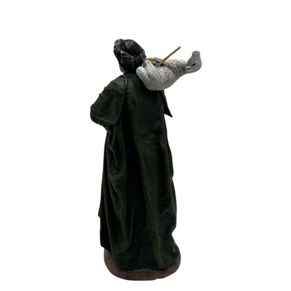 Esta figura de belén está elaborada de manera totalmente artesanal, siguiendo técnicas tradicionales que convierten cada pieza en una pequeña obra de arte. Realizada en barro cocido, ha sido cuidadosamente vestida mediante la técnica de doble entelado con tela encolada, que consiste en la superposición de capas de tejido impregnado en cola para aportar mayor volumen, consistencia y un acabado especialmente realista a las vestimentas.